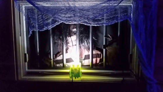 We all remember that bone-chilling phrase from “The Shining” – REDRUM (or ‘murder’ backwards!). Trevor added this scary phrase to a wall inside of the haunted house, right next to the demon that was strategically placed in the window. The creature is seemingly emerging out of a wormhole that Trevor designed out of PETG clear plastic that was stretched for a warped effect.